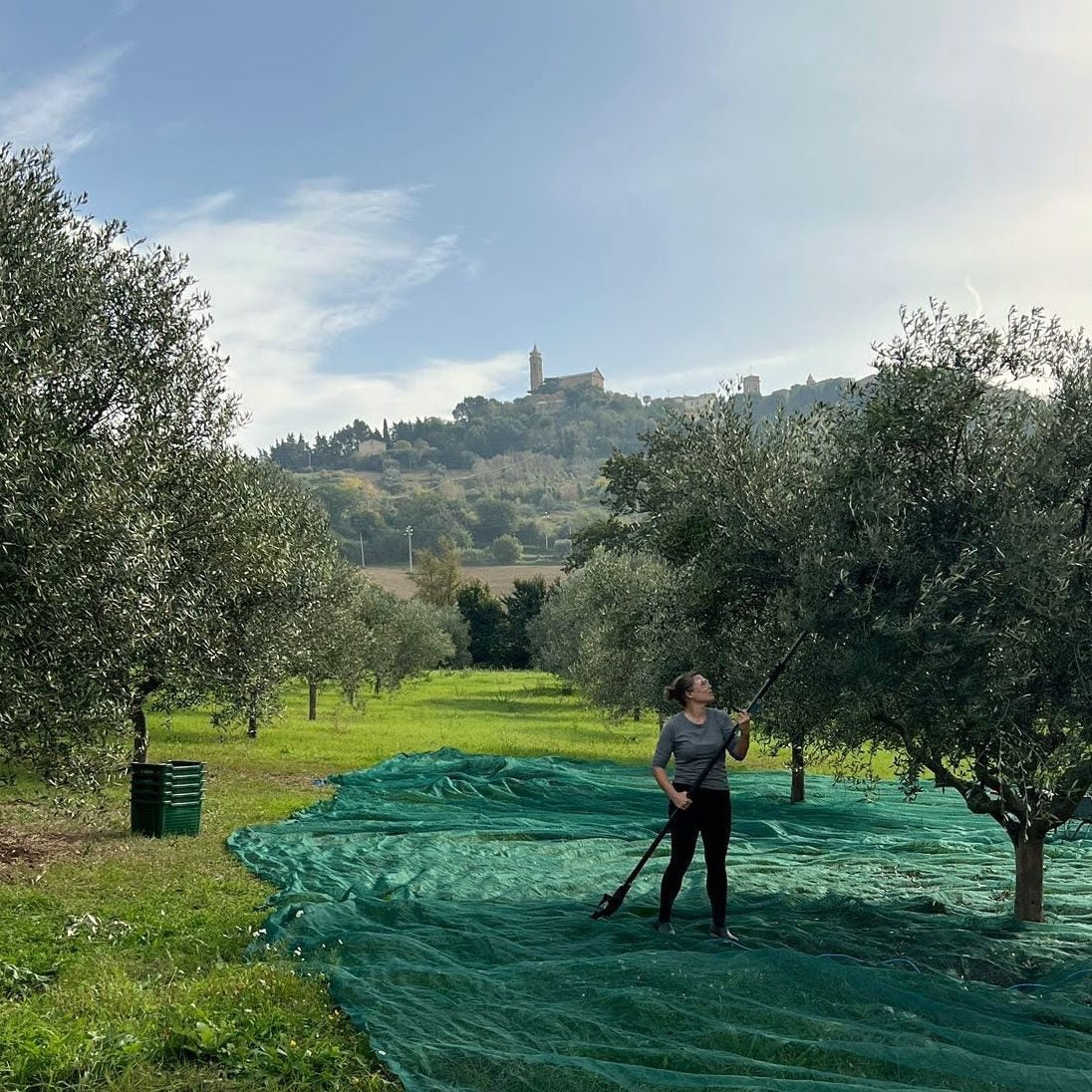 Unser ein Hektar großer Olivenhain mit 180 Bäumen bietet einen herrlichen Blick auf die Hügel und die Kirche von Potenza Picena. Ende Winter beginnen wir mit dem Schnitt und der Düngung der Olivenbäume. Im Mai sind die Bäume voller kleiner Blüten, die im Sommer zu Oliven heranwachsen. Im Oktober ist bei uns Hochsaison, denn dann ernten wir alle Oliven von Hand. Ein elektrischer Schüttler lässt die Oliven sanft auf Netze fallen, die unter jedem Baum ausgelegt werden. Die Oliven werden dann in Kisten gesammelt – rund 450 kg pro Tag. Es ist anstrengend, aber sehr lohnend. Die gesamte Ernte dauert etwa zwei Wochen.