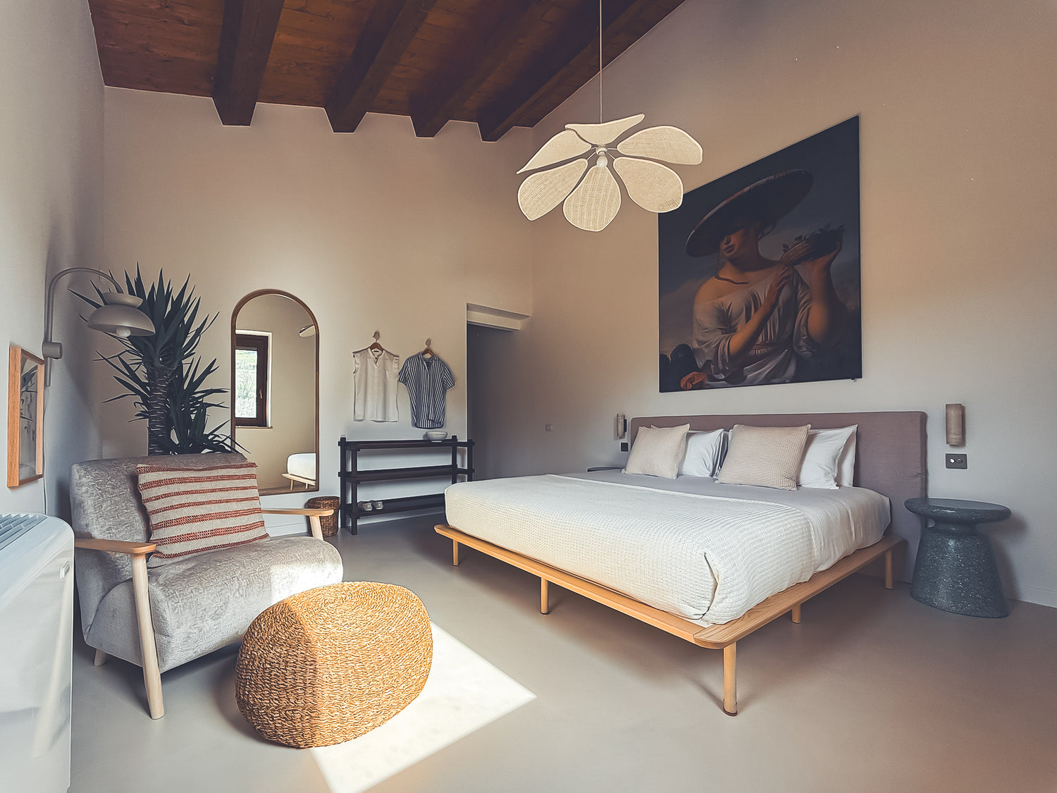 Leccino è luminosa, sobria e delicatamente romantica. Con i suoi alti soffitti in legno e i toni tenui e naturali, la camera crea un'atmosfera tranquilla e accogliente. Leccino dispone di un letto king-size con una comoda testiera fatta a mano, un'opera d'arte di grande impatto e un'illuminazione raffinata. Rilassatevi sulla poltrona con vista mozzafiato sul villaggio e sulla chiesa. La camera presenta dettagli curati come un armadio a vista, sgabelli vintage per la valigia e un pouf intrecciato. Il bagno è spazioso e luminoso. Questo è uno spazio pensato per rilassarsi e rilassarsi un po'. Perfetto per le coppie.